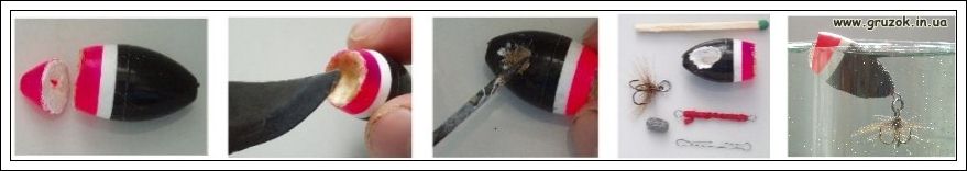 Ну вот «тело» приманки у нас уже есть, теперь из поплавка при необходимости надо вынуть с помощью плоскогубцев антенну. К сожалению, эта операция не всегда, получается, и если антенну не удалось извлечь, и она сломалась то такой поплавок лучше отложить и взять другой. Разберетесь с ним позже.